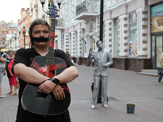 Руки крепко связаны черным скотчем, рот заклеен. На музыкальных инструментах приклеены красные кресты — в таком виде около 30 музыкантов вновь прошли по самой известной пешеходной улице столицы, где испокон веков молодым и талантливым давали свободу для самовыражения.